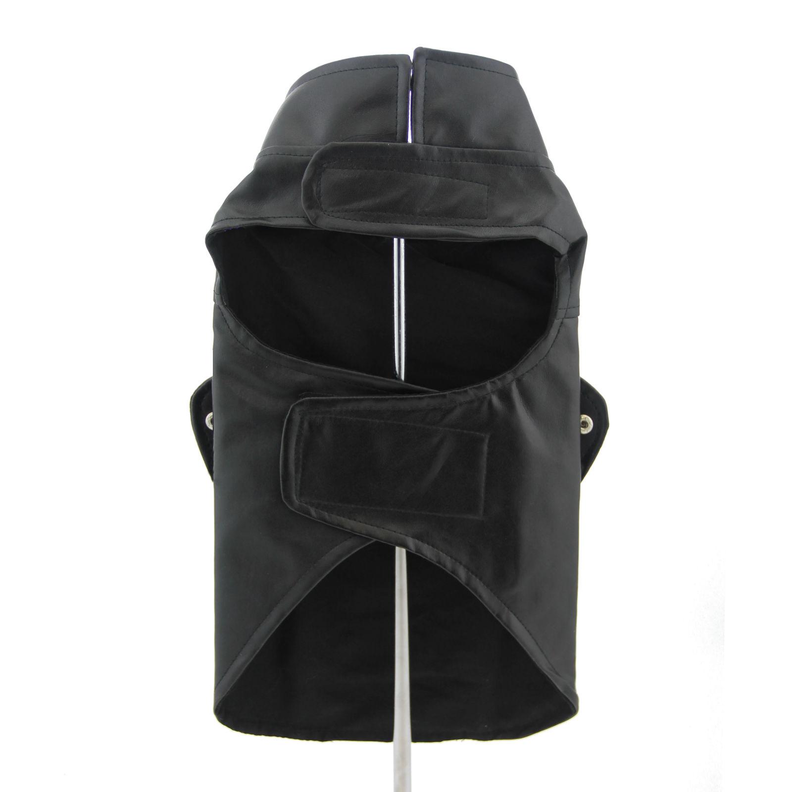 Sports an embroidered red vintage motorcycle patch and metal studs. Serves as a harness with a heavy D-ring leash attachment for smaller sizes (XS-M); larger sizes have a leash hole. It has adjustable Velcro closures at the neck and chest for a secure and comfortable fit.