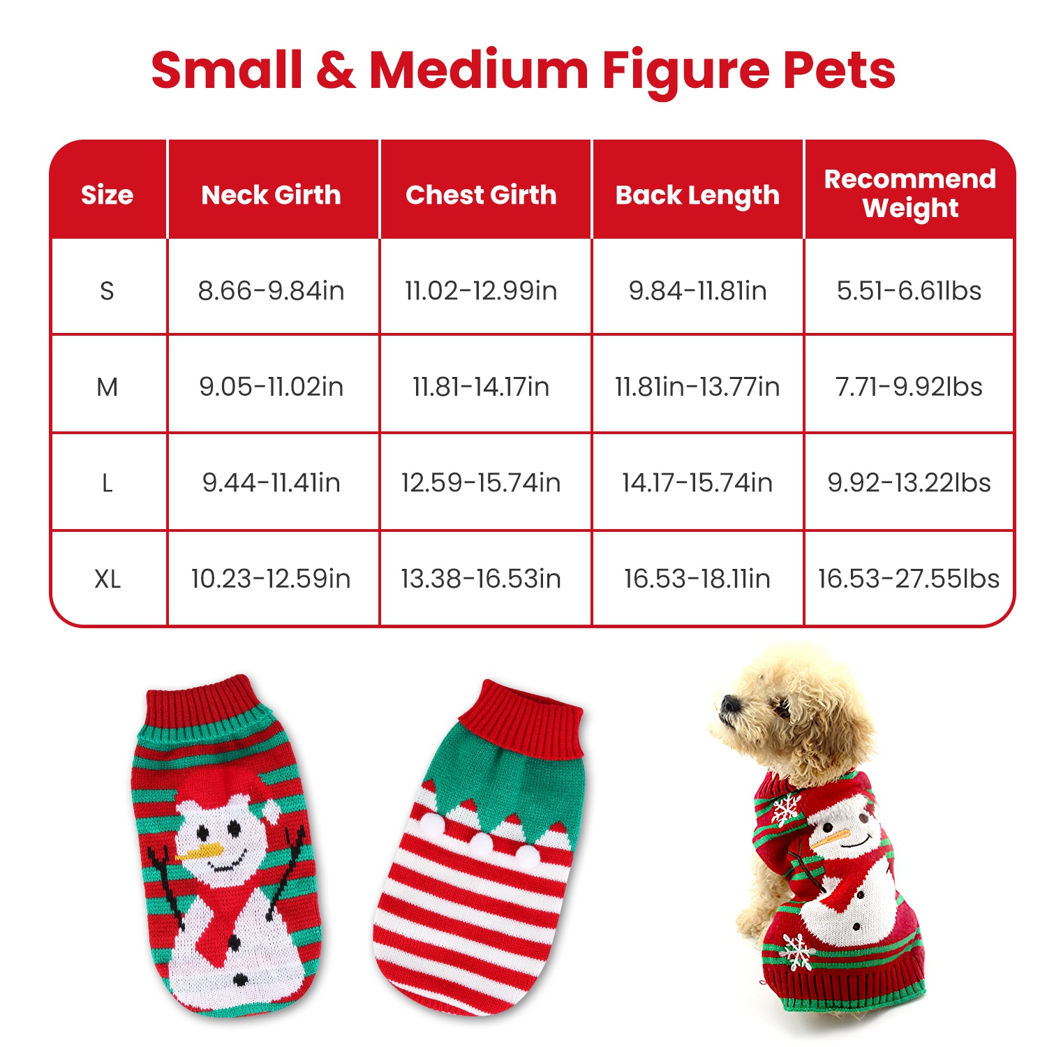 Why not let your furry friend get involved in the cheerful Christmas atmosphere? This pet Christmas sweater is designed with stylish and cute patterns on soft, skin-friendly material, making your pet the most attractive one at any holiday party while offering a comfortable wearing experience. Available in four sizes (S/M/L/XL), the listing provides detailed neck girth, chest girth, back length, and recommended weight data. You can easily choose the most suitable clothing for your small and medium-sized pets.